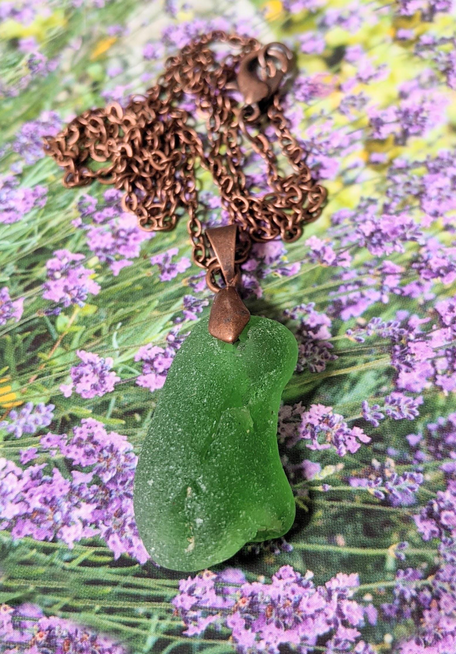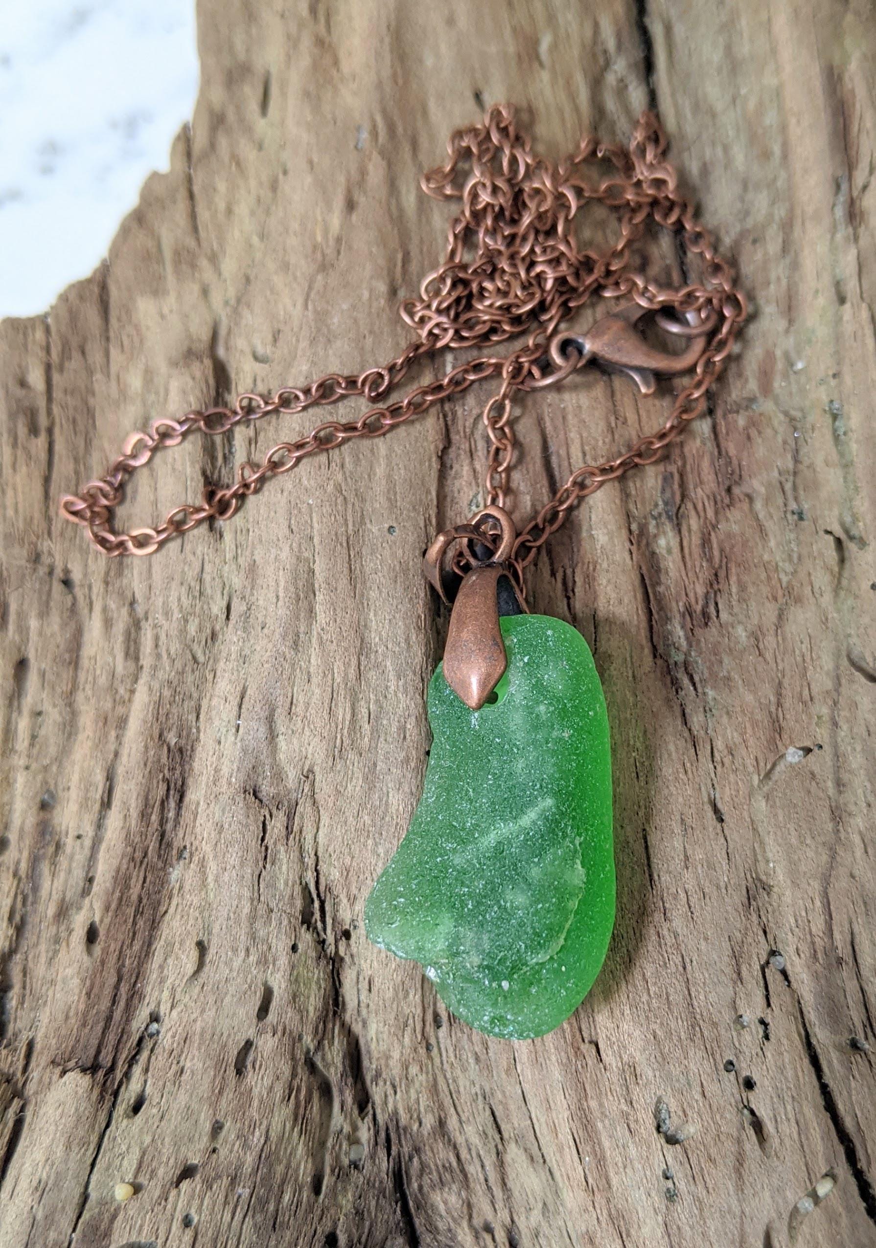 Discover the beauty of the oceans of Cape Cod with this chunky chonky and simple handcrafted emerald green authentic ocean tumbled bonfire sea glass pendant, suspended on an 18-inch copper-colored chain and lobster clasp. The sea glass, naturally tumbled by the waves, was personally found on the scenic beaches of Cape Cod, Massachusetts by me, making this piece a true coastal treasure. If you hold this beauty up to the light you can see the effects of the glass being part of a beach bonfire in days gone by!