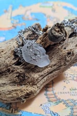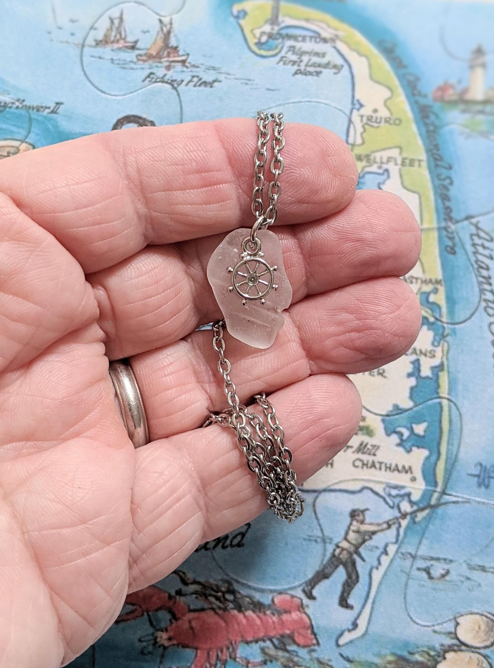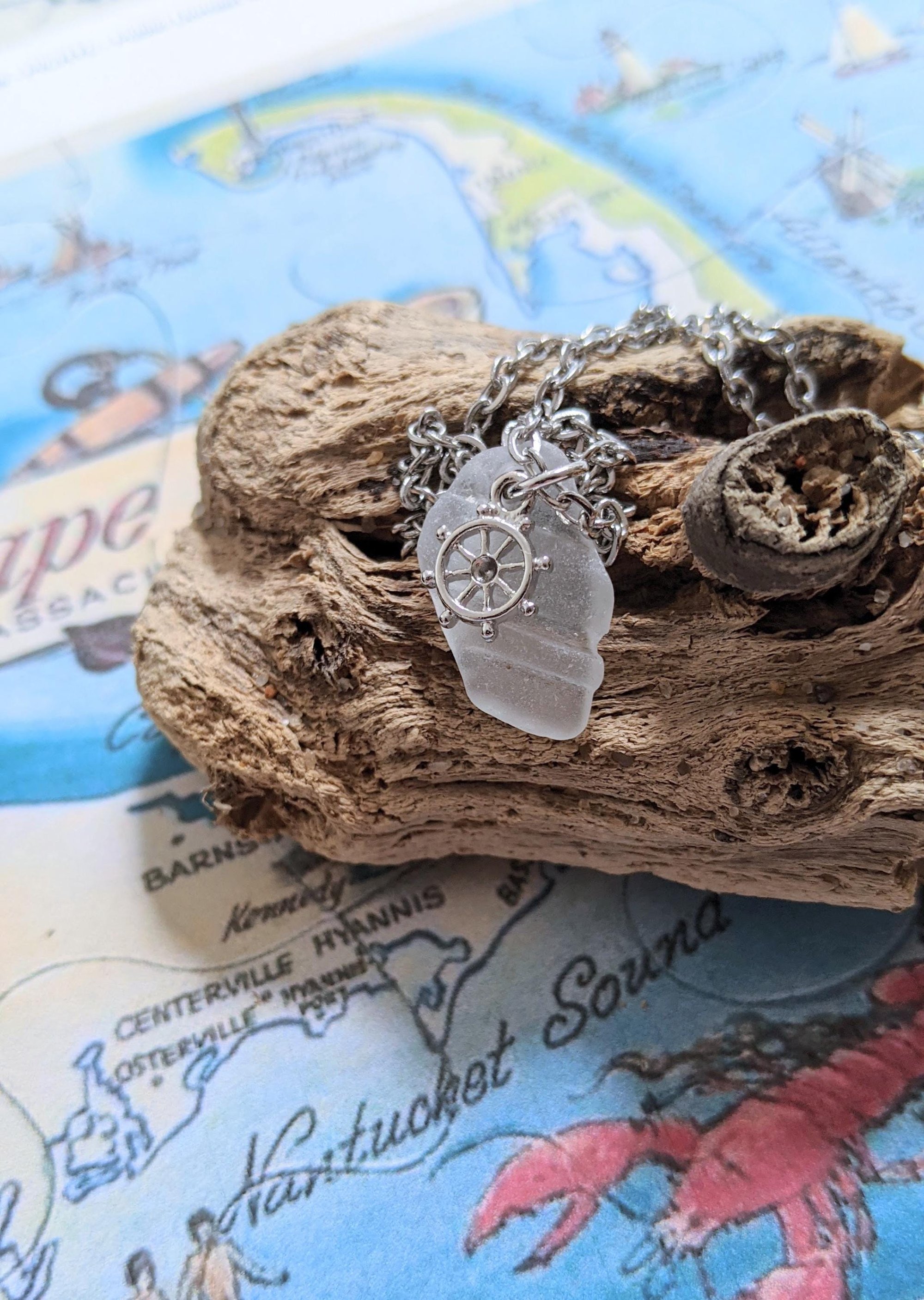 Discover the beauty of the oceans of Cape Cod with this delicate and simple handcrafted frosty white authentic ocean tumbled sea glass pendant, including an adorable silver colored ships wheel charm to help you stay on course, all dangling from a 19" silver-colored nickel-free chain. The sea glass, often called Mermaid Tears or Natural Sea Gems, naturally tumbled by the waves, was personally found found by me (or sometimes my husband!) on the scenic beaches of Cape Cod, Massachusetts, making this piece a true coastal treasure. This piece looks to be a bottle neck top of a vintage tonic (soda) bottle, a beautiful and awesome find and can also be used as an essential oil diffuser (glass part only) to make the sea glass shine like a gem!
