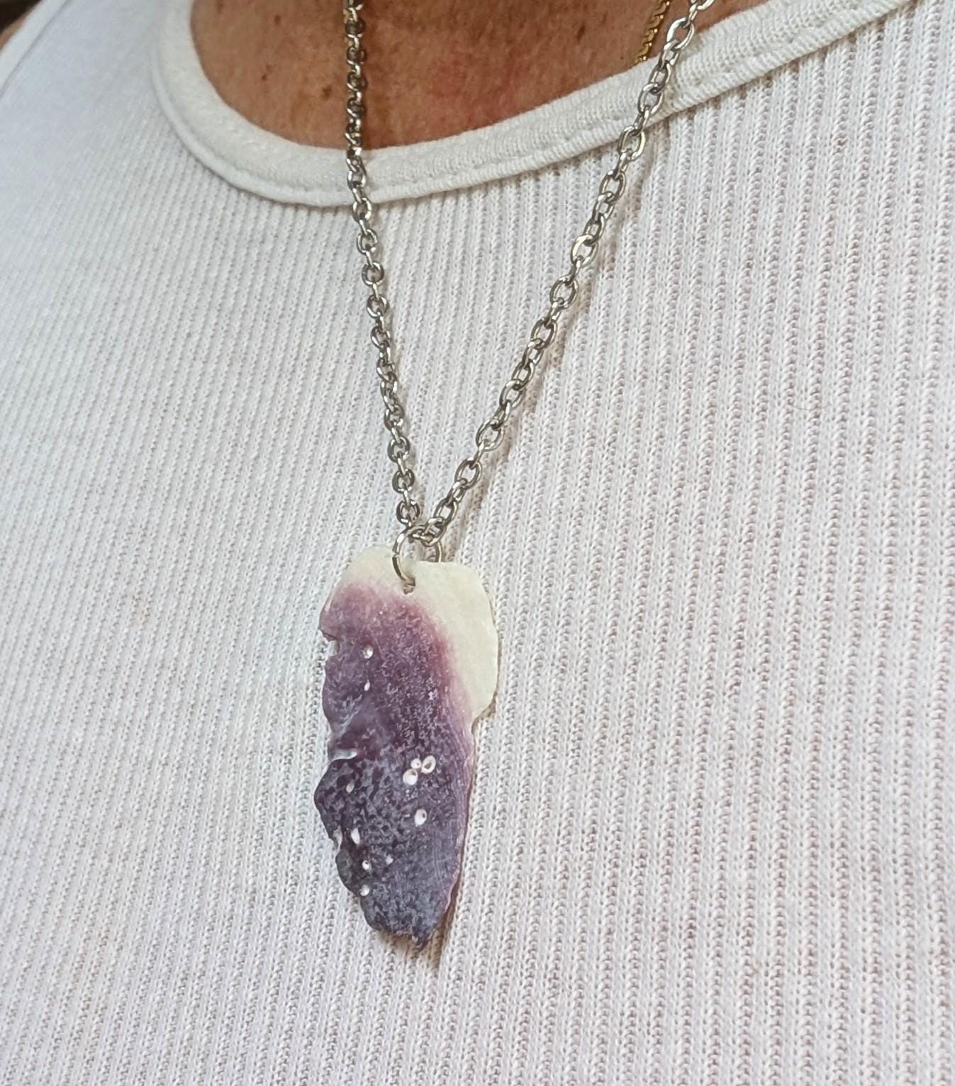 This listing is for a beautiful larger but light-weight cream and plum colored Purple quahog clamshell pendant. The pendant was made by me on beautiful Cape Cod Massachusetts. All of the wampum used to create these coastal creations were found on the beaches of Cape Cod Massachusetts, and each pendant is lovingly created with authentic ocean tumbled and naturally polished quahog shell. I do not cut or machine polish them which makes each piece ideal to use as an essential oil diffuser while giving the purple quahog shell a lovely natural sheen. Each piece is as I found it on the local beaches where I live. The color, clarity, and nature-made, perfectly imperfect pieces make each of these a one of a kind boho chic coastal treasure. This necklace is about 21" in long including the length of the piece, and made with nickel-free materials. I hope you will enjoy one of these Cape Cod treasures for yourself or as a lovely gift. This pendant or others i have listed would pair perfectly with the Purple clamshell quahog earrings in my other listing.