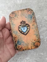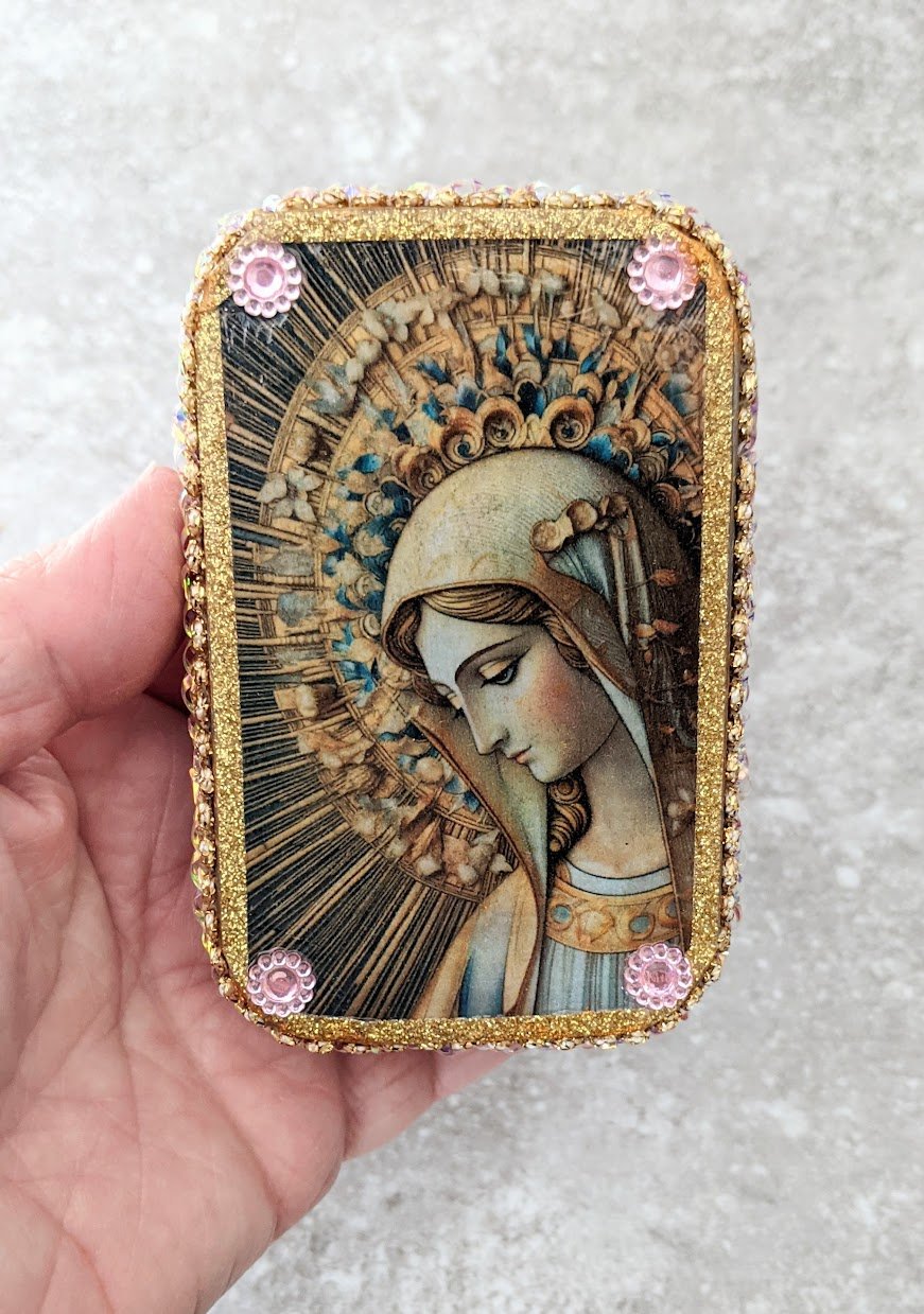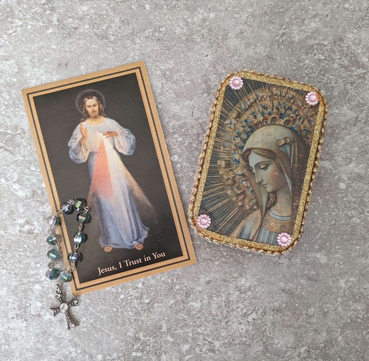 This one-of-a-kind, handmade Catholic pocket shrine and Rosary tin box honors Our Lady, The Rosa Mystica, Mystical Rose. Created from an upcycled tin, this portable travel altar rosary tin box is carefully crafted over several days using vintage holy cards, Catholic ephemera, digital artwork, and mixed-media elements. The interior and exterior of my Catholic Rosary Pocket Shrines are adorned with various materials as they speak to my heart, including but not limited to, lace, fabric flowers, paint, colorful rhinestones, and other delicate embellishments, creating a truly sacred and devotional piece.