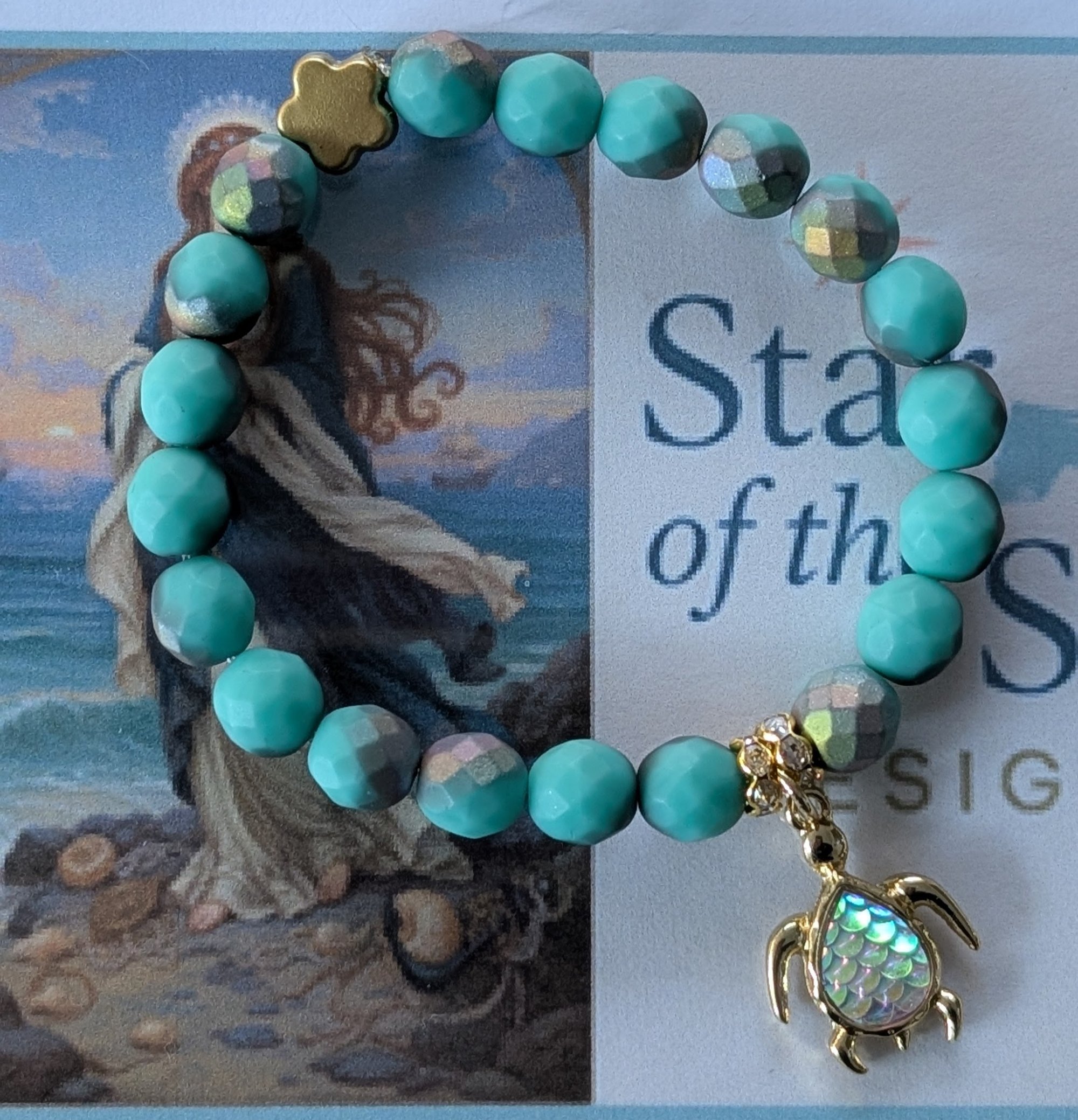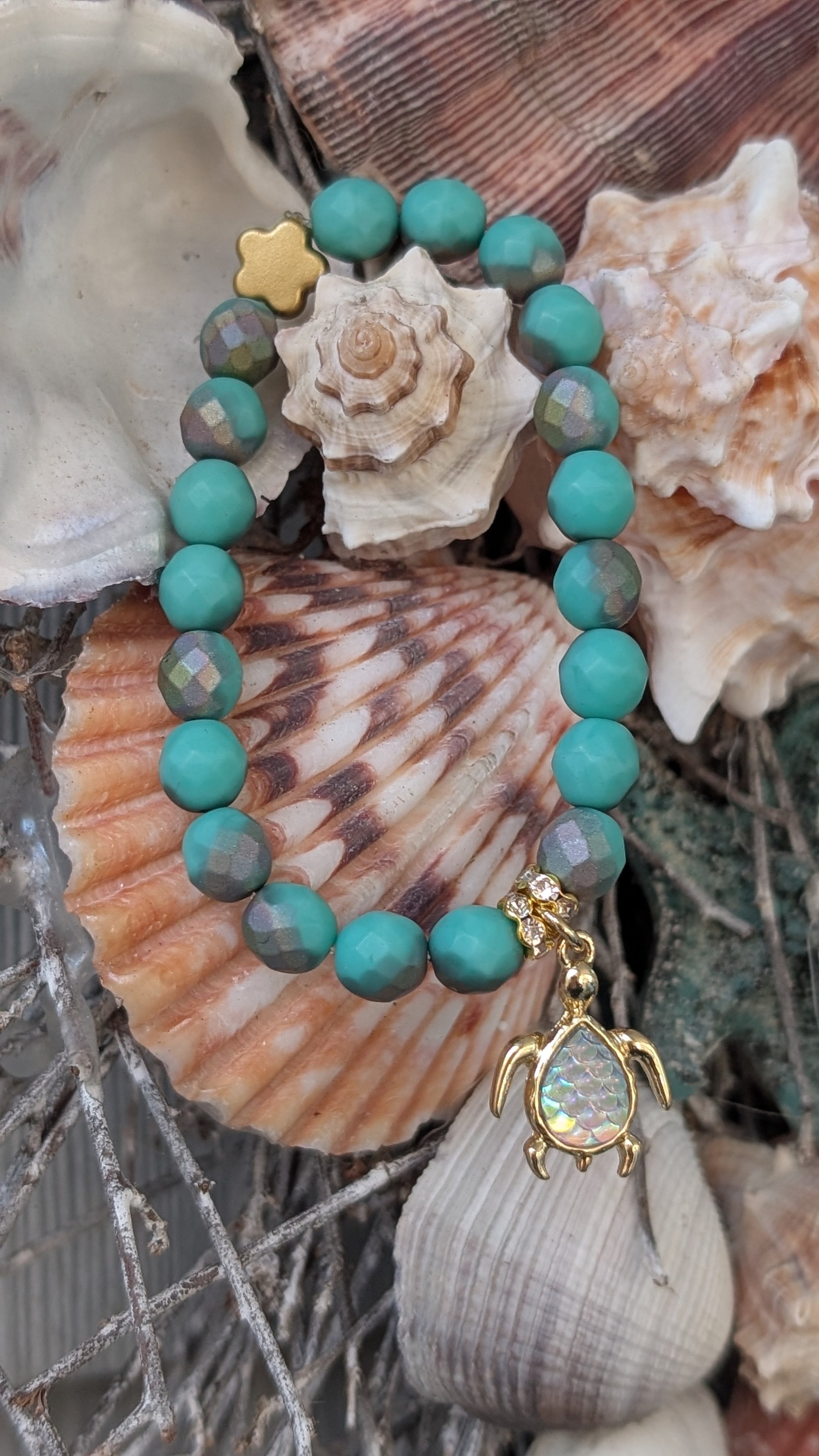 The centerpiece is an gold toned sea turtle Charm featuring a teardrop shape with iridescent mermaid colors in a lovely fish scale pattern. It is securely attached with a touch of sparkle. Strung on durable elastic .8mm stretch cord, this bracelet is comfortable, easy to wear, and fits most wrist sizes, small to average. Custom sizes are available.