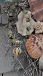 This lovingly handcrafted Green Tourmalinated Quartz Round St. Dymphna Bracelet is a one-of-a-kind piece by me, a local artist on Cape Cod, Massachusetts.