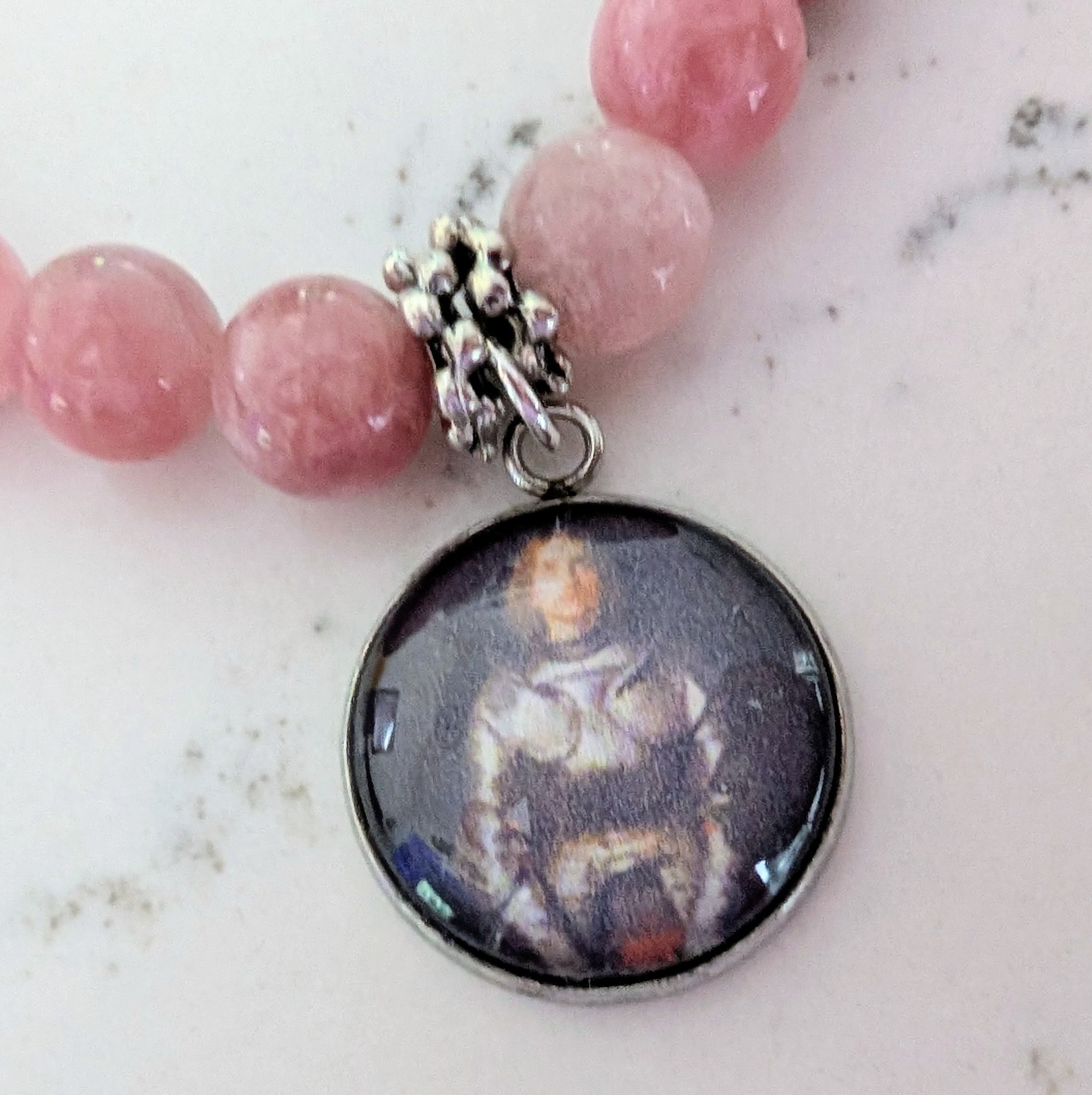 Beautiful bracelet featuring 20 8mm Sunstone Gemstones with a 18 mm stainless steel glass bubble charm featuring a replica of a painting of St. Joan of Arc by John Everett Millais. The bracelet comes with a holy card sized image of the painting. The bracelet will fit an average sized wrist between 6 and 7 inches. This bracelet will make a beautiful gift for yourself or someone you love.